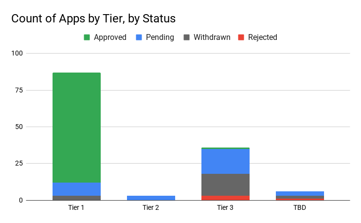 A state chartered "full reserve" bank would likely be considered a Tier 3 entity. On average, Tier 3 applications received decisions in 823 days with only one Tier 3 charter receiving approval. On the other hand, Tier 1 applications received a decision in 94 calendar days, with 86% receiving approval.
