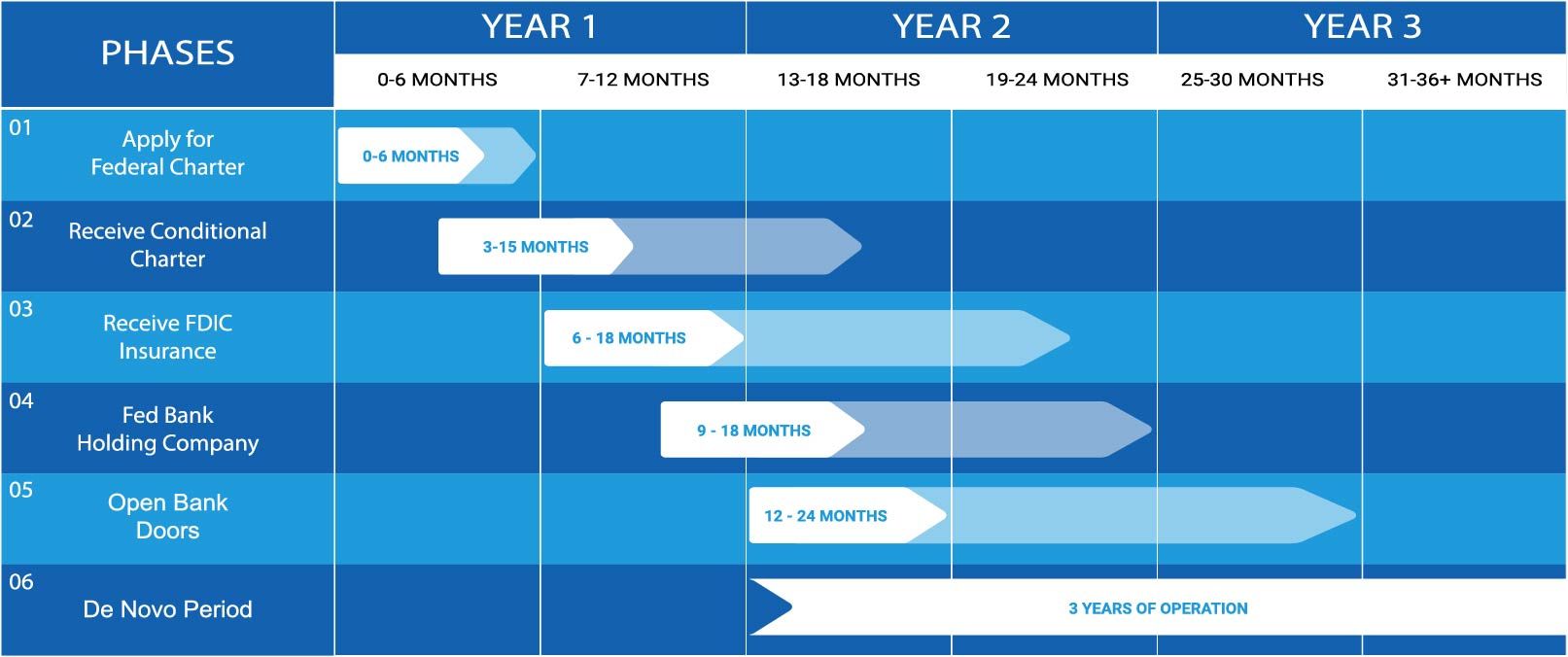 There are variations and types of charters including federal, state, trust, ILC, credit card, and both insured and non-insured institutions. Charter applications are rated as Tier 1, 2, or 3 charters. We are pursuing a federally insured Tier 1 banking charter.
